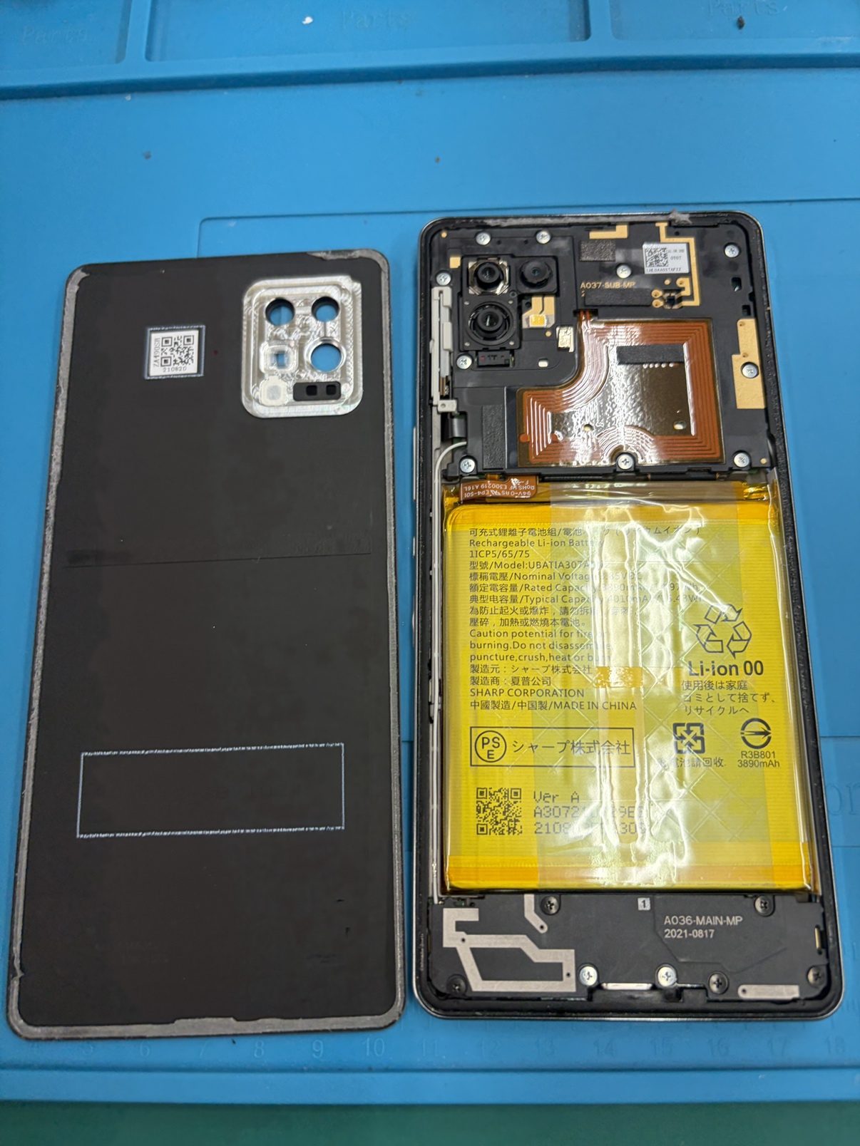 バッテリーですが青っぽいシートの上にゆるく接着されているのでシートを外し