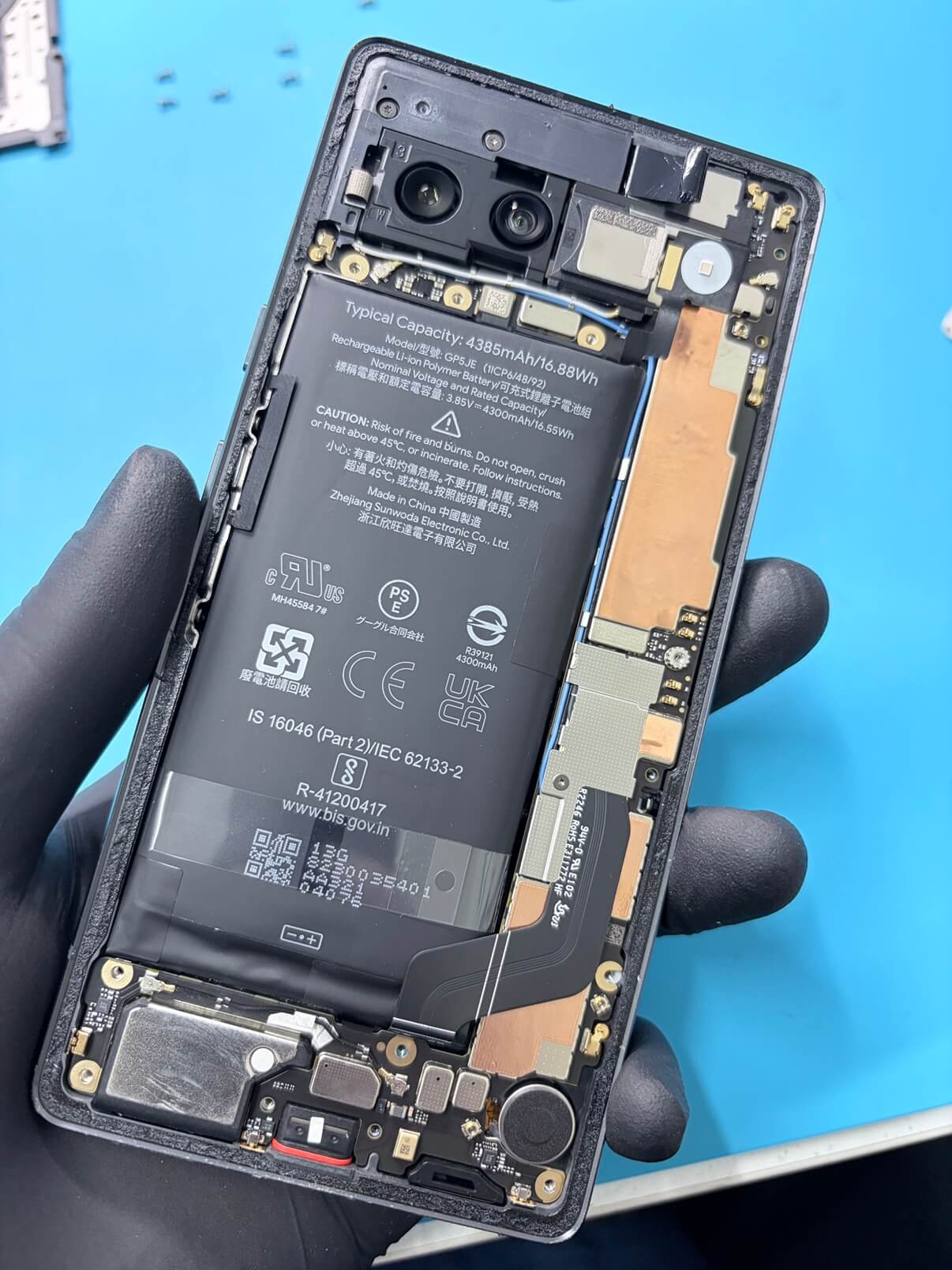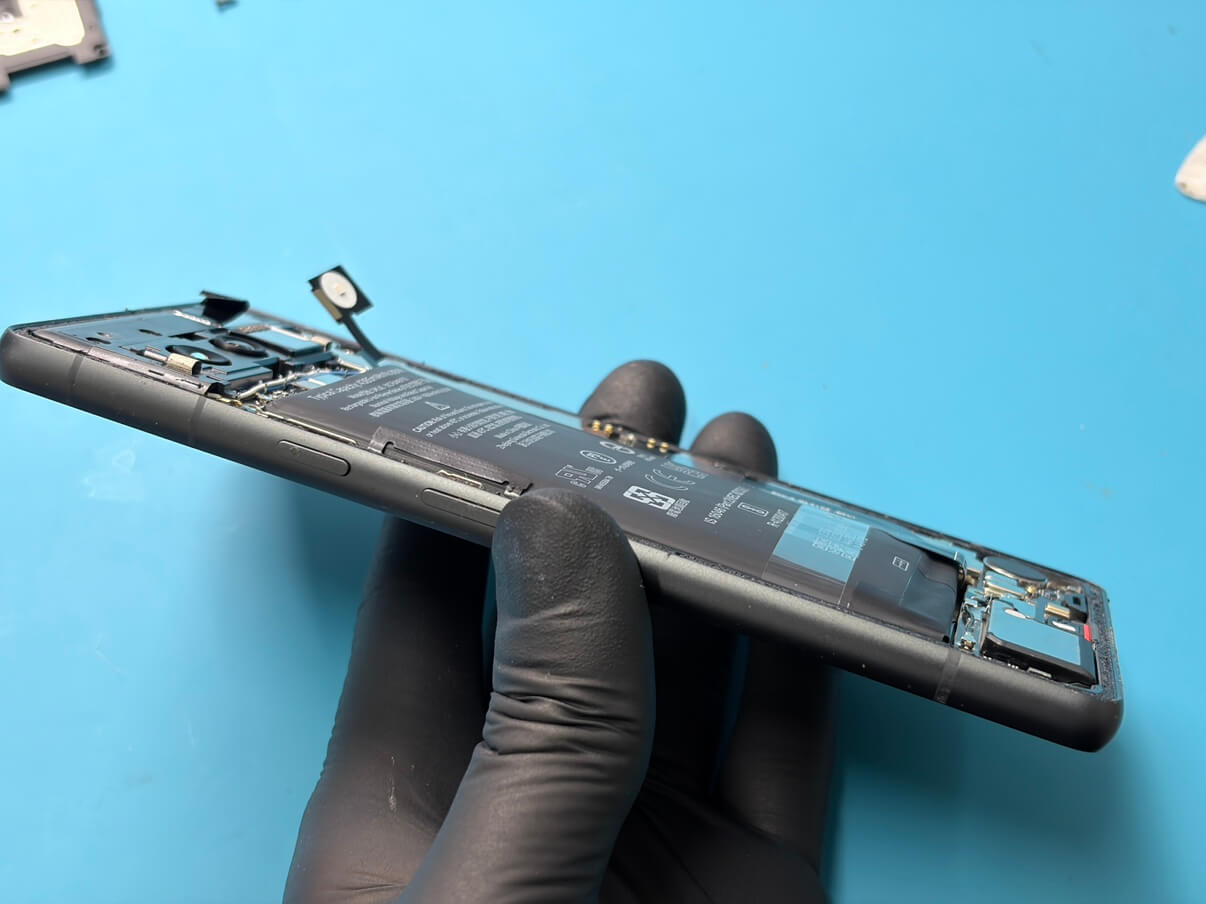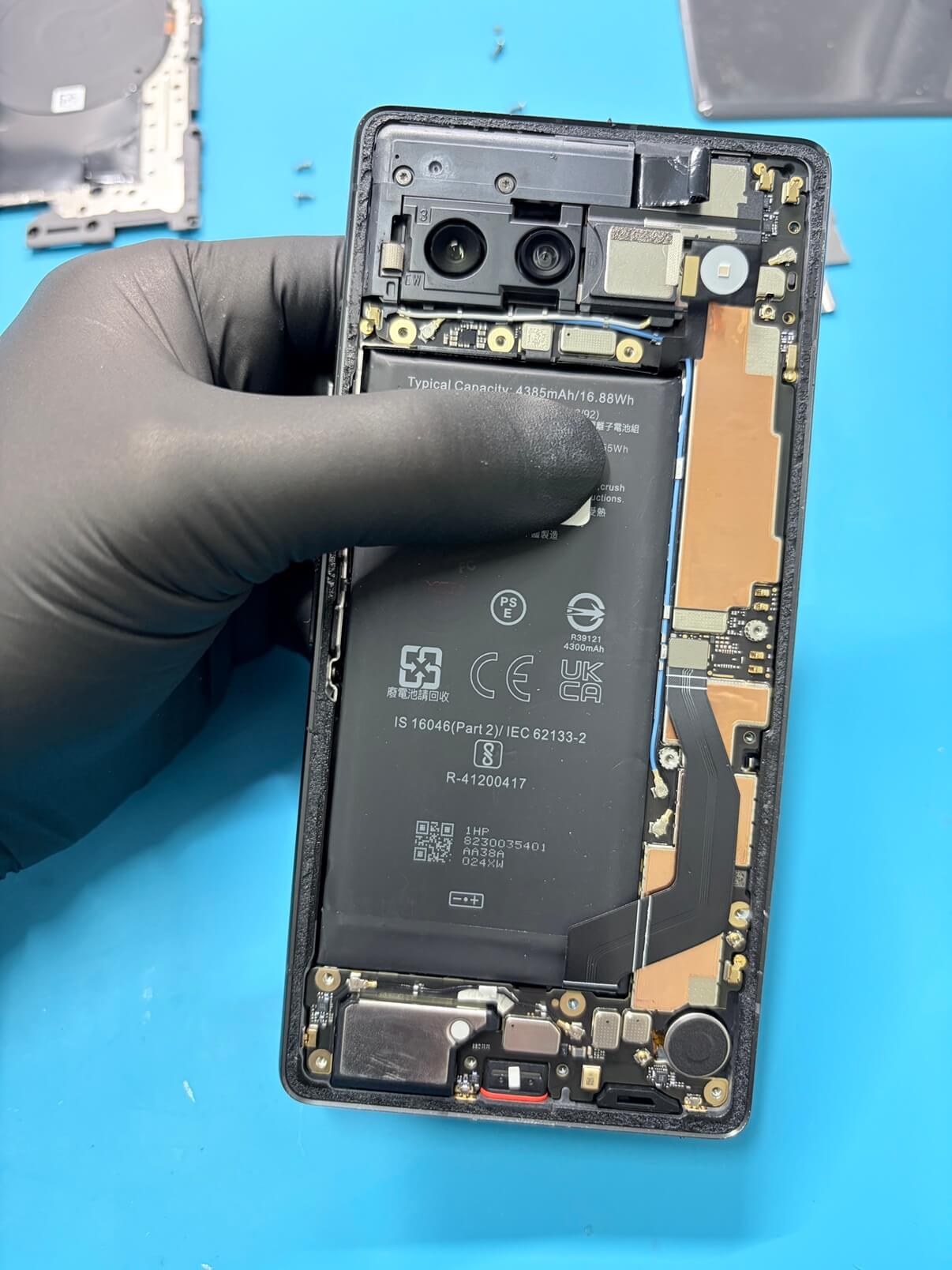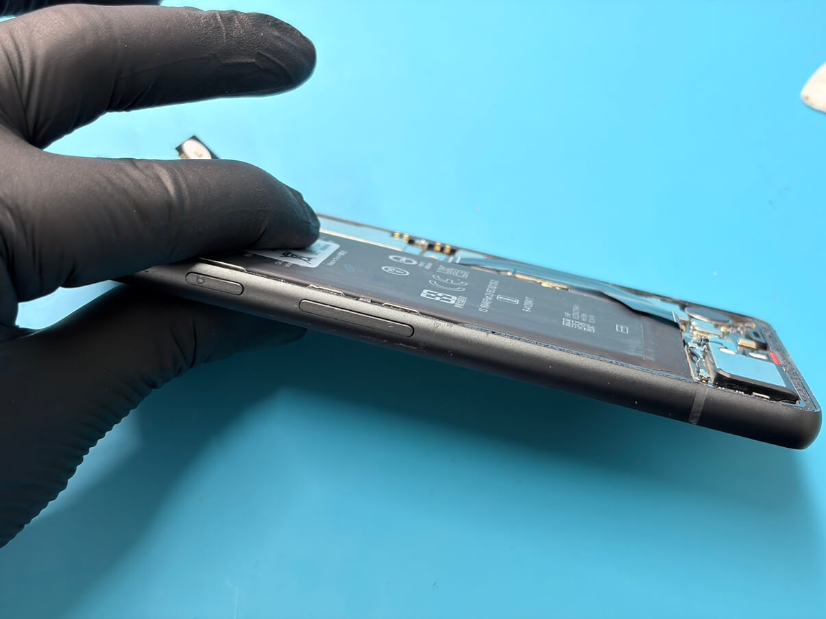 膨張していたバッテリーを取り外し、新品のバッテリーに交換。基板周辺や背面パネルの接着状態も丁寧にチェックし、無事に修理完了です!